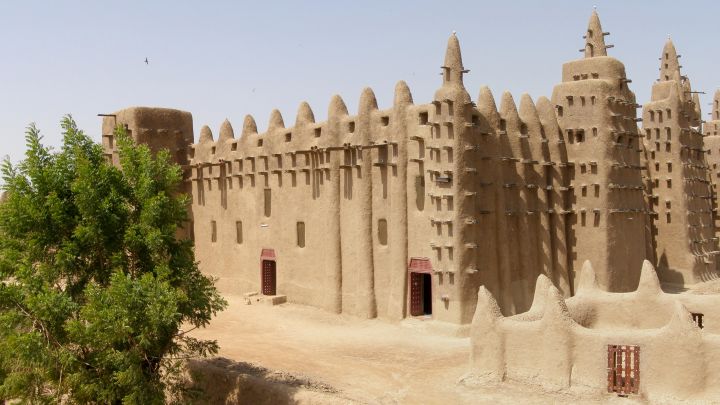 Den store moskeen i Djenné i Mali stammer også fra 1200-tallet, men dagens struktur – verdens største adobe-bygning – ble oppført så sent som i 1907. Fra 1226 til 1670 var Mali et stort imperium, og på 1300-tallet var herskeren, Mansa Musa, en av verdens rikeste menn. Foto: Bluesy Pete/Wikicommons