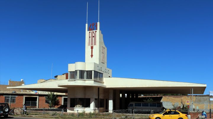 Denne perlen er kjent som Fiat Tagliero-bygningen. Den er tegnet av arkitekt Giuseppe Pettazzi i 1938 og var opprinnelig en vanlig bensinstasjon i Art Deco-stil, beliggende i Eritreas hovedstad Asmara. Eritrea var italiensk koloni i årene 1890–1941. Foto:Sailko/Wikicommons