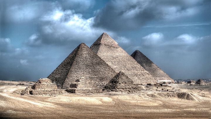 De tre verdenskjente pyramidene i Giza utenfor Kairo utgjør i virkeligheten et gravanlegg. Den største, Kheops-pyramiden, består av 2,3 millioner steinblokker, hvorav hovedandelen veier 2–3 tonn. De fleste mener dette bygget ble oppført for 4500 år siden gjennom utstrakt bruk av slaver, mens andre mener det var et nasjonalt prosjekt. Foto: Yasser Nazmi/ Wikicommons