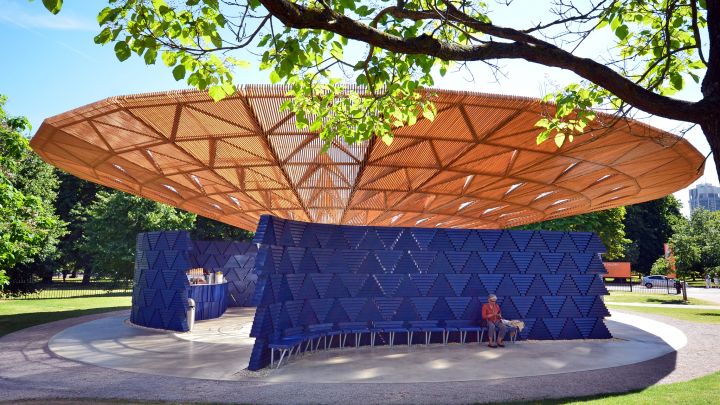 Serpentine Gallery i London, tegnet av Francis Kéré fra Burkina Faso i 2017, er nok et eksempel på at afrikanske arkitekter gjør seg gjeldende globalt. Foto: George Rex/Wikicommons