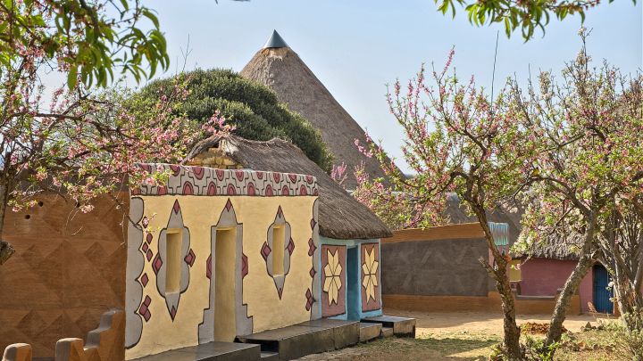 Husene i en basotho-landsby i nasjonalparken Golden Gate Highlands i Sør-Afrika er dekorert i ulike farger. Foto: Getty Images/Istockphoto