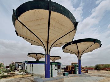 Den sopplignende bensinstasjonen i Mauritanias hovedstad Nouakchott er et eksempel på leken, nærmest humoristisk arkitektur. Foto: Philipp Meuser