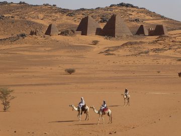 Kamelryttere ved Meröe-pyramidene i Sudan. Foto: Hans Birger Nilsen/Wikicommons