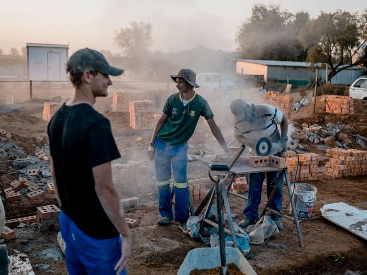 Favner hvitt Alt arbeid i Orania utføres av hvite, noe som er et bevisst valgt for å styrke og sysselsette spesielt utsatte innbyggere, samt skape solidaritet og trygghet i samfunnet. Her bygges det et hus på en av Oranias mange byggeplasser.