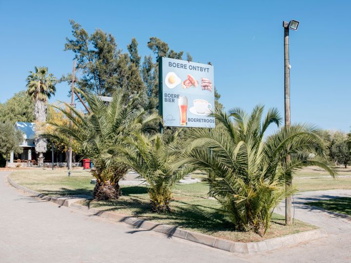 Frokost for kjentfolk Et skilt med teksten «Boer-frokost» står ved inngangen til Orania. En boer eller afrikander er en sør-afrikaner av nederlandsk, tysk eller hugenottisk opprinnelse, som var blant de første nybyggerne som dyrket jorden. Reglene for å bli akseptert som borger i Orania, er strenge. Potensielle innbyggere må skrive en omfattende søknad, de blir gjenstand for en bakgrunnssjekk, og det vil nesten alltid være et krav om at man er afrikander. Alle foto: Jeremy Suyker/ITEM
