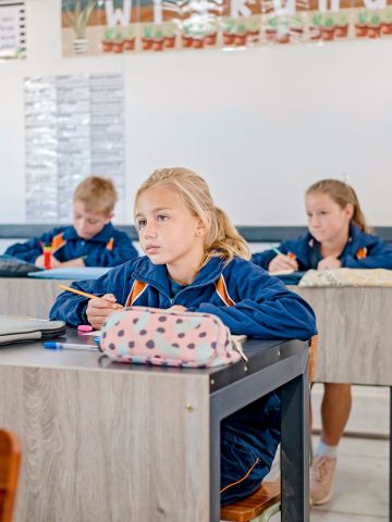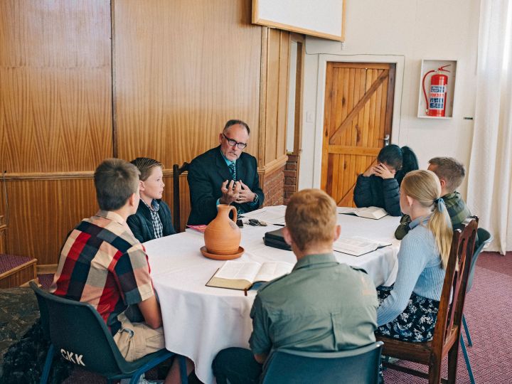 Skoleflinke Unge elever lytter oppmerksomt i en matematikktime ved skolen i Orania, som drives av en kalvinistisk organisasjon. De tilhører en retning innen protestantisk kristendom som legger vekt på Guds suverenitet og bibelsk autoritet (som gammeltestamentlig morallov). Orania har fire skoler og et internat for barn fra gårder utenfor området. Pensumet legger stor vekt på afrikanderhistorie og har et religiøst preg. 100 prosent av elevene i Orania består eksamener og fullfører utdanningen. Alle foto: Jeremy Suyker/ITEM