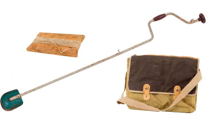 Farfars fiskesaker Isbor, snørevinne og veske havnet på Skogmuseet. Foto: Digitalt Musuem