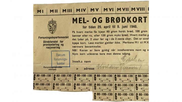 Rasjonering Mel- og brødkort fra Forsyningsdepartementet utstedt de første ukene etter at krigen kom til Oslo. Donert til Oslo Museum. Foto: Henrik P. Libell