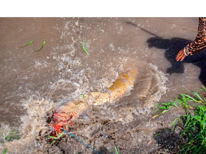 Et fanget arapaima-eksemplar flyttes om bord i en kano. Under fisket lastes fangsten over i en større båt som frakter fisken til Mamirauá-instituttets base. Under arapaima-fisket møtes familier ved Mamirauá-instituttets base. De kommer fra en rekke mindre lokalsamfunn langs elven. Dette «kollektive» fisket finner sted kun én gang i året, i en tomånedersperiode rundt november og desember. Under fisket flyttes fangsten mellom båtene av flere grunner: for å gi plass til harpunene i de små båtene, og for å frakte flest mulig fisk til Mamirauá-basen der sløyingen skjer.