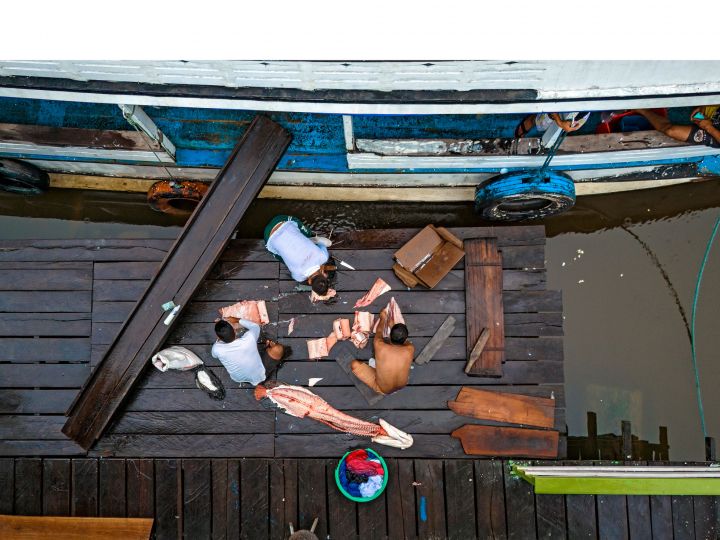 Mannskapet på båten «General de guerre» sløyer en arapaima på en brygge. Denne fisken er en viktig matkilde for lokalbefolkningen. Den spises lokalt når mange skal mettes, eller konserveres i salt.