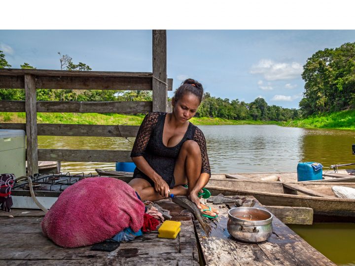 Mens mennene fisker, blir kvinner og barn igjen på husbåten i Mamirauá-reservatet. Her sløyer en kvinne en harniskmalle (Hypostomus plecostomus), lokalt kalt bodò, en fisk som finnes i overflod her og verdsettes høyt i matlagingen.