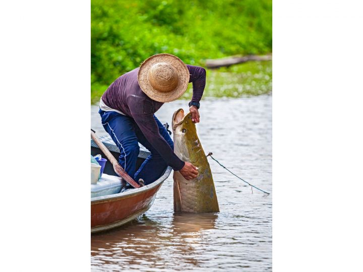 Denne formen for fiske består av lange perioder med venting og foregår under alle værforhold, fra kraftige tropiske regnskyll til brennende sol. Det spesielle ved den ikoniske fisken Arapaima gigas – som de lokale kaller pirarucu – er at den omtrent hvert 15.–20. minutt må opp til overflaten for å puste luft, et fenomen fiskerne kaller boiada. Dette er til stor hjelp i fisket. Alle foto: Marco Raccichini