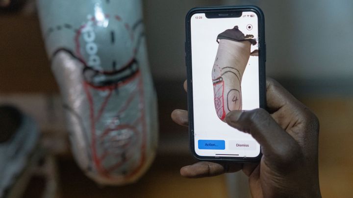 Digitalskanning Ortopedteknolog Amos Wafula skanner stumpen til Steven Karanja med en 3D-app.