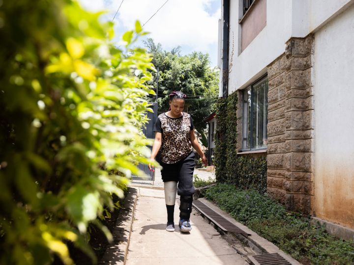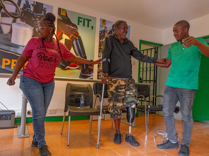 Da Steven Karanja tar sine første skritt med det nye benet, brer det seg et smil over ansiktet hans. Kona Esther Wambui følger spent med fra stolen ved siden av, tydelig rørt. Hun løfter mobilen for å ta noen bilder, slik at hun kan minnes dagen hun beskriver som «den beste i vårt liv».