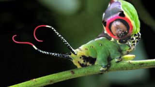 Denne fargerike larven presenterer seg for fienden med en helt spesiell oppvisning. Forkroppen trekkes sammen slik at de fremste kroppsleddene utvides til et underlig hode. Hele «ansiktet» er en bløff. «Klovnenesen» er larvens virkelige hode, og «...