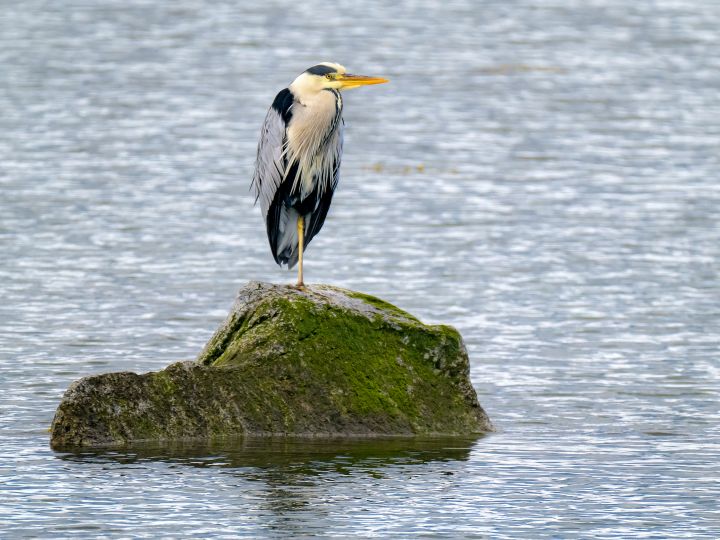 Får snart slekten på besøk Gråhegren sitter ofte på faste steiner i strandsonen og hviler, som her på Inderøy i Trøndelag. Foto: Ove Bergersen/Samfoto/NTB