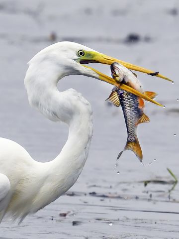 Durkdreven fisker Egretthegre med fangst av stor karpefisk. Foto: Steinar Myhr/Samfoto/NTB