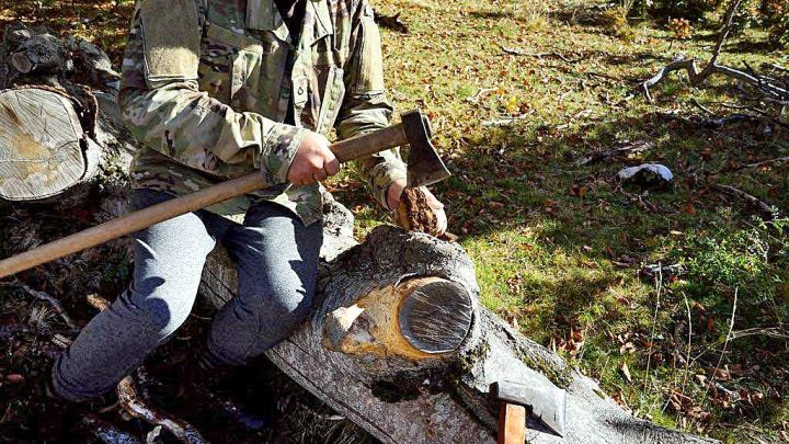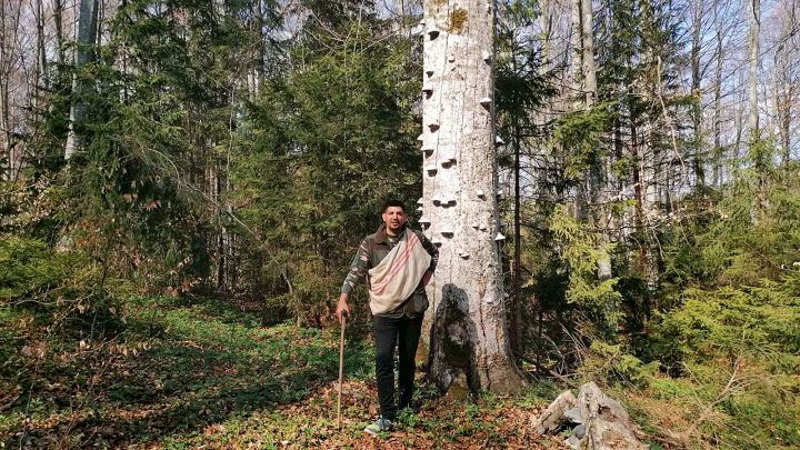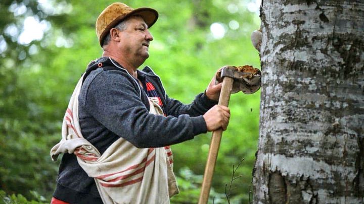Læremesteren Karoly Mate sr. hugger av en knuskkjuke fra en død stamme. Soppene finnes kun fra 800 meter over havet. Hattemakerne må derfor høyt til fjells der bjørnene bor, for å få tak i soppen. Foto: Karoly Mate jr.